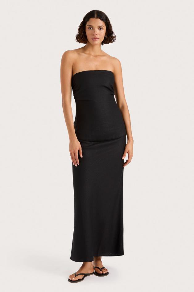 FAITHFULL-malliston tunnusomainen siluetti, uudelleen kuvioitu uusilla, korostetuilla yksityiskohdilla ja suunniteltu 100 % eurooppalaisesta Flax®-pellavasta. Kyseessä on rento, lomahenkinen midimallinen hame, jossa on joko keskikorkea tai korkea vyötärö ja joustava vyötärönauha. Klassisen mustan värisenä siinä on vino leikkaus ja pehmeä helma, joka ulottuu nilkkojen yläpuolelle. Yhdistä uima-asun tai topin, kuten Audrey-liivin, kanssa monipuoliseksi käyttöön.