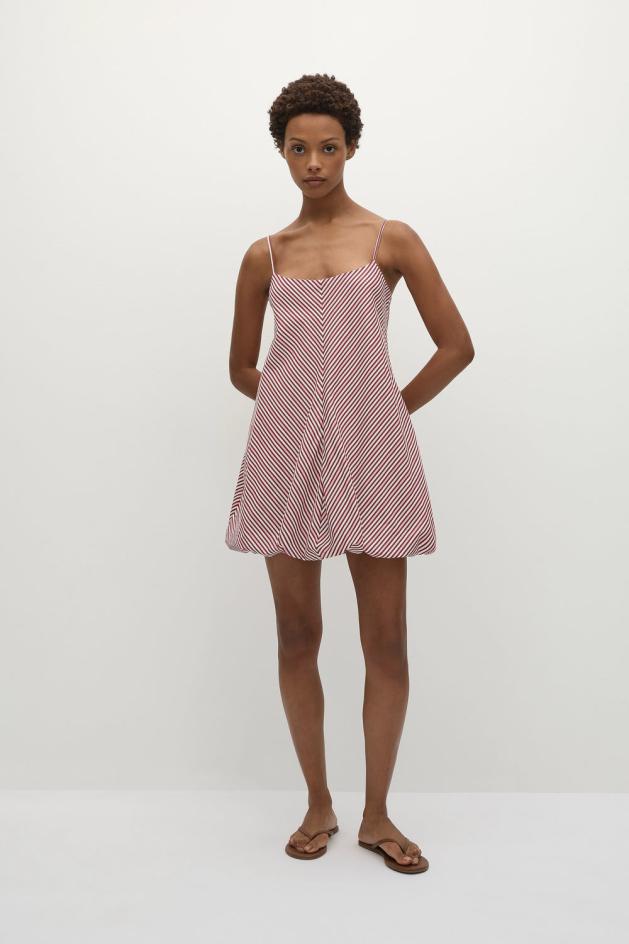 FAITHFULL-malliston tunnusomainen siluetti, uudelleen kuvioitu uusilla, korostetuilla yksityiskohdilla ja suunniteltu 100 % luomupuuvillasta lankavärjätyllä lomahenkisellä raidalla, joka yhdistää pinkin eri sävyjä. Siinä on pyöreä pääntie ja ohuet, pituudeltaan säädettävät olkaimet, jotka istuvat rennosti ylävartalon läpi. Sitten se laskeutuu runsaaksi siluetiksi, jossa on ylisuuri kuplamainen helma, joustava hihansuu ja lyhyt vartalonmyötäinen nauha. Täydellinen lomakumppani, yhdistä se yksinkertaisten sandaalien kanssa päiväkäyttöön.