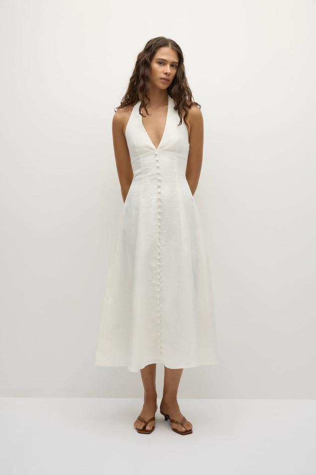 Naisellinen 1960-luvulta inspiroitunut midimekko, jossa on syvä V-pääntie ja nauhakoriste takana kaula-aukossa. Hienovaraiset tikkaukset rinnan alla antavat lisämuotoa ja edessä valenapit. Mekko on puoliksi istuva yläosan läpi ennen kuin se laskeutuu leveneväksi A-linjaiseksi hameeksi, joka ulottuu polvien alapuolelle. Vyötärön takaosassa on rypytetty osa, joka antaa lisäjoustoa. Suunniteltu tunnusomaisesta 100 % eurooppalaisesta Flax®-pellavakankaasta kermanvalkoisena. Yhdistä sandaali- tai kissankorkokenkiin kesätilaisuuksiin.