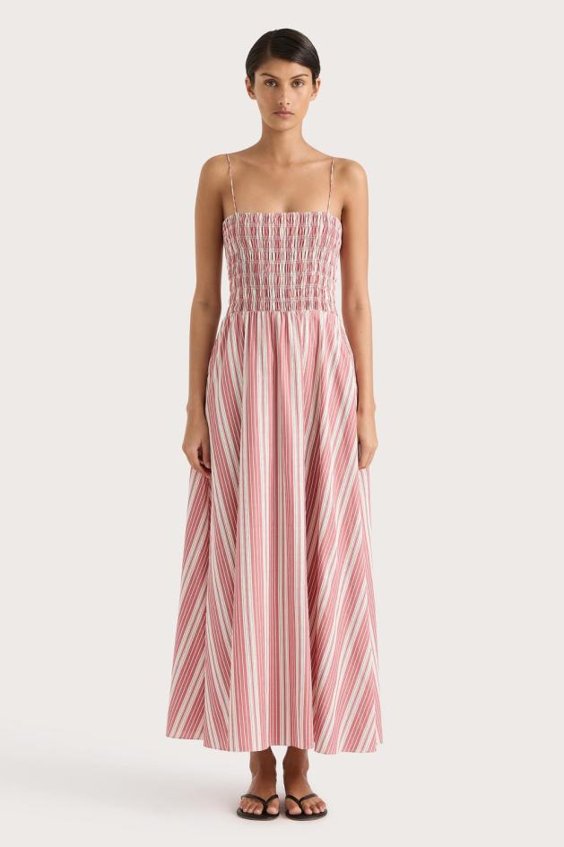 Lomahenkinen maksimekko, jossa on ohuet, hentoiset olkaimet, joiden pituus on säädettävä ja jotka istuu yläosan läpi. Yläosa on myös rypytetty, mikä lisää joustavuutta ja lisää käyttömukavuutta. Hameosa on rypytetty vyötärön ympäriltä ja laskeutuu A-linjaiseksi nilkkoihin asti. Ainutlaatuisesta 100 % orgaanisesta puuvillasta suunniteltu mekko, jossa on lankavärjätty pehmeä kirsikanpunainen raita. Käytä sitä yksinkertaisten sandaalien kanssa jokapäiväiseen käyttöön.