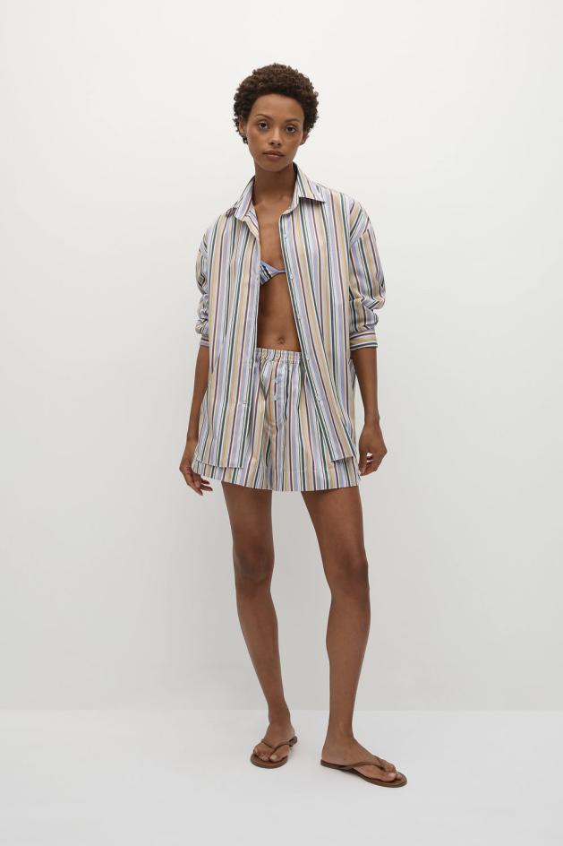 Ένα μποξεράκι σε στυλ boyfriend με λεπτομέρεια με μανίκια μπροστά και κουμπιά, σχεδιασμένο από ένα χαρακτηριστικό 100% οργανικό βαμβάκι σε μια πολύχρωμη ρίγα βαμμένη με νήμα, εμπνευσμένο από το ελληνικό νησί της Σίφνου. Με πλαϊνές τσέπες και χαλαρή εφαρμογή, προσφέρει εντυπωσιακή εφαρμογή. Φορέστε το πάνω από το ασορτί μπικίνι τοπ Ania και το κάτω μέρος Adra με το σορτς Lonia για καθημερινή καλοκαιρινή εμφάνιση.