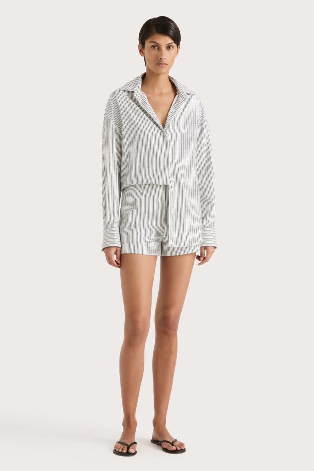 オーバーサイズのフィット感とカスタムメイドのオーガニックオーバルボタンが特徴のボーイフレンドスタイルのボタンアップシャツ。ヘリンボーン織りの100%オーガニックコットンとレーヨンをブレンドした非常にソフトな生地を使用し、柔らかなブルーとクリームのストライプがデザインされています。他のコットンシャツとは異なり、このストライプは先染めコットンから生み出されています。ゆったりとしたシルエットで、幅広いスタイリングと季節の変わり目にぴったりです。クラシックなトラウザーズと合わせたり、お揃いのNoto Shortと合わせて季節を問わず普段着として着用できます。