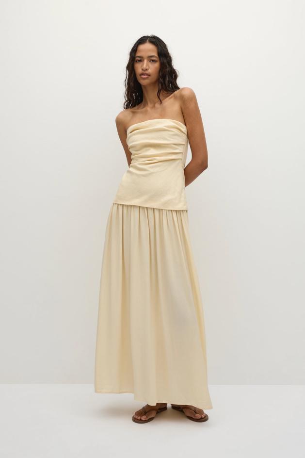 今シーズンのシルエット。フィット感のあるボディスに、シグネチャーのヨーロッパ産Flax®リネン100%を使用したマキシドレス。フロントにはギャザーのディテールが施されています。ドロップウエストで、柔らかなギャザースカートはAラインに広がり、足首下丈のクロップド丈です。スカートはレーヨン素材で、ボディスとのコントラストが際立ちます。バターイエローのシンプルなヒールを合わせれば、気負わずに上品な装いを演出できます。