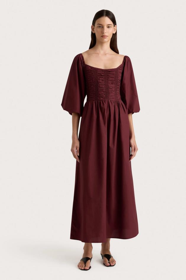季節の変わり目にぴったりのマキシドレス。丸みを帯びたスクープネックラインと、肘まで届くバルーンスリーブが特徴で、袖口はゴム仕様です。深みのあるボルドーカラーで、シャーリングのボディスと、足首まで届くギャザー入りのAラインスカートが特徴です。シンプルなフラットヒールまたはキトンヒールを合わせれば、洗練された雰囲気でありながらリラックスした着こなしが一年中楽しめます。