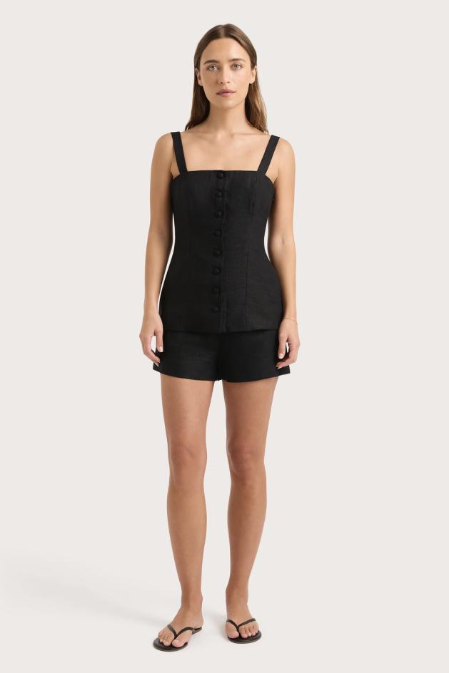 ヒップにフィットするクラシックなミッドライズミニショーツ。シグネチャーのヨーロッパ産Flax®リネン100%生地を使用し、ブラックカラーで仕上げました。フロントは滑らかな肌触りで、総裏地付きなので型崩れしにくいのが魅力です。Corbiere Vestの下に着れば、バケーション気分を盛り上げてくれます。