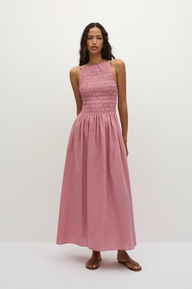 高めのスクエアネックと細めのストラップが特徴的な、フェミニンなミディ丈ドレス。丈を調節できる細めのストラップ付き。ボディスにシャーリングを施しストレッチ性を高め、ウエストでギャザーを寄せ、足首丈の柔らかなAラインスカートへと導きます。柔らかなバレンタインピンクのシグネチャーである100%オーガニックコットン素材を使用し、着脱も簡単で、長時間のランチやバケーションにもぴったりです。夏のワードローブにピンクを取り入れるのにぴったりのアイテムです。