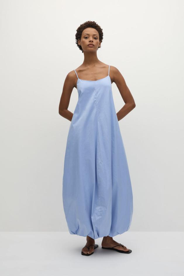 FAITHFULLのシグネチャーシルエットを、洗練されたディテールで再解釈。柔らかなブルーの100%オーガニックコットン素材を使用。ラウンドネックに細いストラップ(長さ調節可能)が付いており、上半身はゆったりとしたフィット感です。オーバーサイズのバブルスカートは、裾にゴム入りで足首まで届くクロップ丈で、ボリューム感のあるシルエットに仕上がっています。シンプルなサンダルと合わせれば、アペリティーヴォタイムにぴったりの、まさにバケーションのお供です。