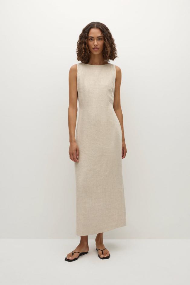 FAITHFULLのシグネチャーシルエットを、新たなディテールで再解釈し、ヨーロッパ産のFlax®リネン100%生地でデザインしました。ボートネックとバックネックのキーホールが特徴のノースリーブマキシドレス。同系色のボタンが付いています。滑らかな仕上がりで体に優しくフィットし、ややAラインのスカートに。バックウエストのタイでウエストを絞って、ウエストを絞って着こなせます。温かみのあるニュートラルカラーで、サンダルと合わせれば、気楽なバケーションスタイルを演出できます。