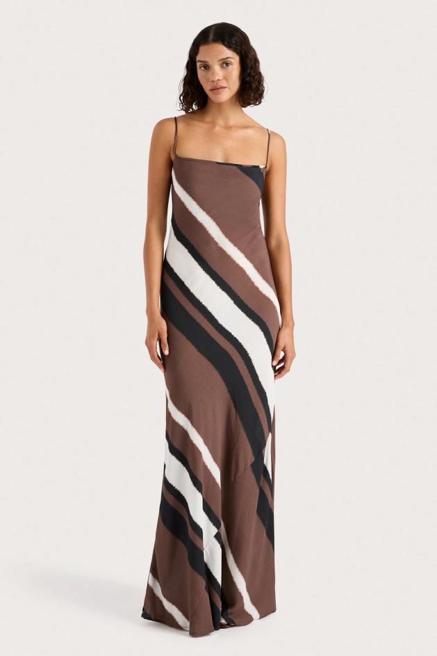 ストレートネックラインと細めのストラップが特徴の、バケーションスタイルのマキシドレス。レトロなチョコレートブラウンのストライプを軽やかなレーヨンクレープで織り上げ、バストはセミフィット、足首にかけてクロップ丈の柔らかなバイアスカットシルエットに仕上げました。バックボディスにはキーホールカットが施され、紐で長さを調節できます。昼夜を問わず、シームレスに着こなせるデザインです。