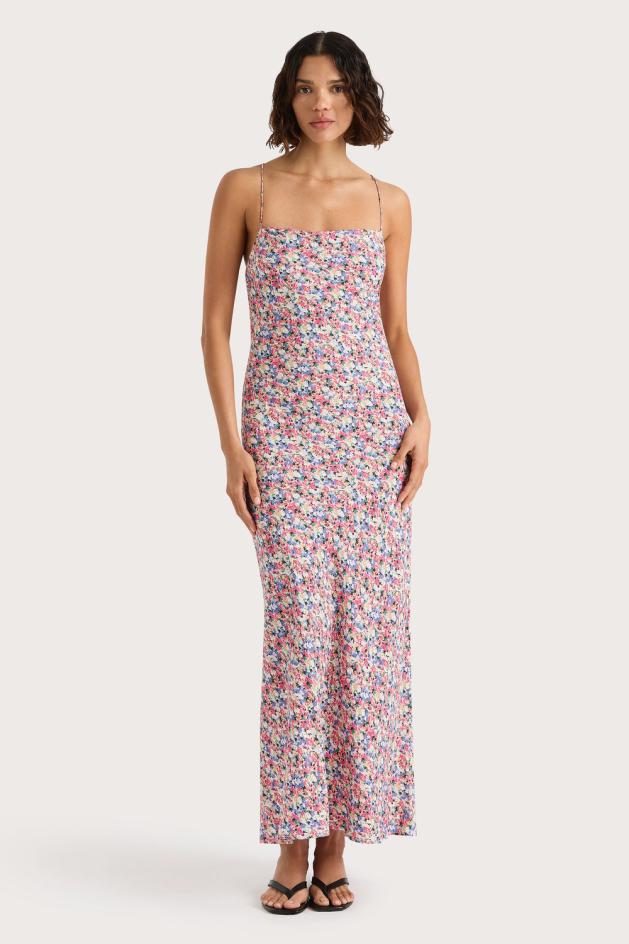 일자 네크라인과 얇은 조절 가능한 스트랩이 돋보이는 여성스럽고 로맨틱한 미디 드레스입니다. 오픈 백 디자인에 조절 가능한 크로스오버 스트랩과 타이 디테일이 특징입니다. 바이어스 컷 실루엣으로, 발목까지 오는 스트레이트 스커트로 자연스럽게 떨어지는 실루엣을 자랑합니다. 부드러운 레이온 소재에 화려한 플로럴 모티프가 더해져 해변 점심 식사나 촛불을 켠 저녁 식사에 어울리는 가볍고 편안한 여행 동반자가 되어줍니다.